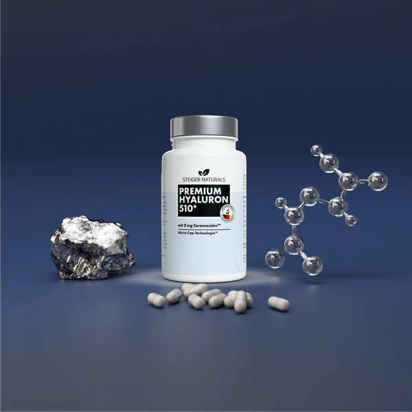 Unsere Steiger Naturals Hyaluron Kapseln enthalten nun den beliebten Feuchtigkeitsmagneten Hyaluronsäure in einer höheren Dosierung: 510 mg pro Kapsel. Natürlich in bewährter Kombination mit lebensnotwendigen Vitalstoffen Zink,Vitamin C und Vitamin B12. Einzigartig in Deutschland haben wir unseren Hylauronsäure Kapseln außerdem den Anti-Aging-Helfer und Powerwirkstoff Ceramide zugesetzt!